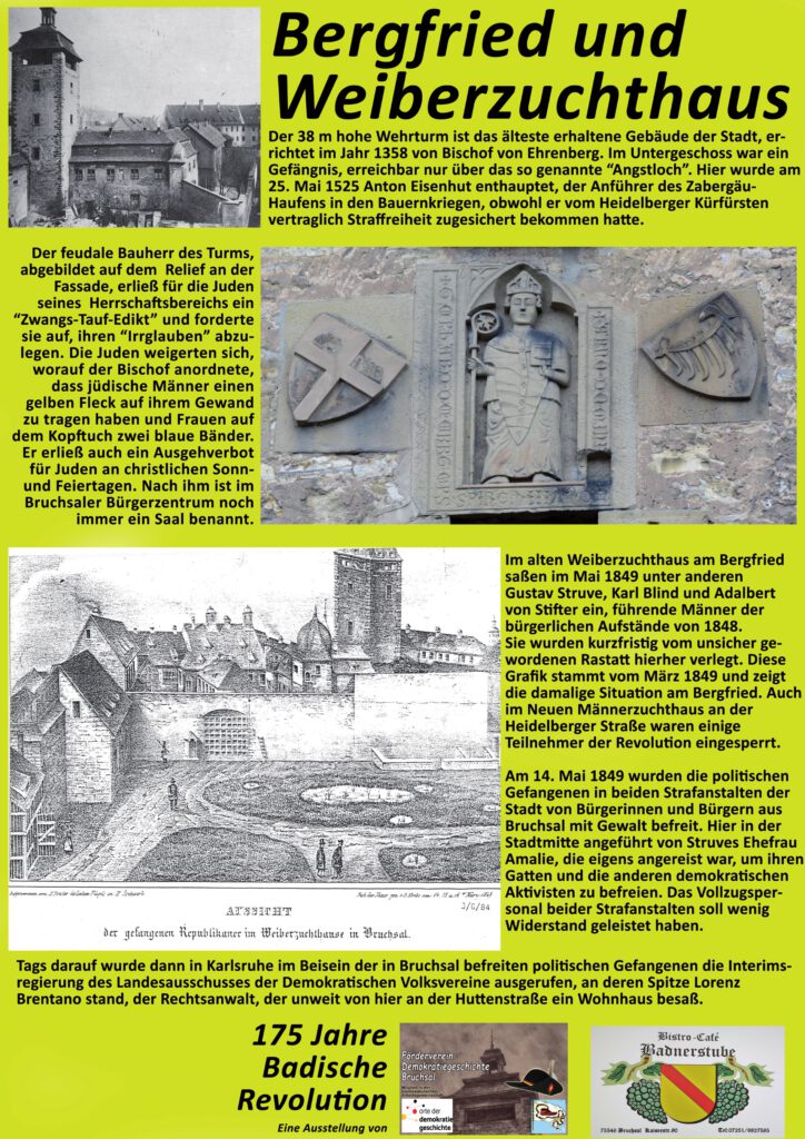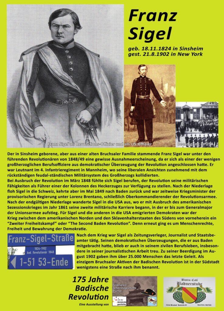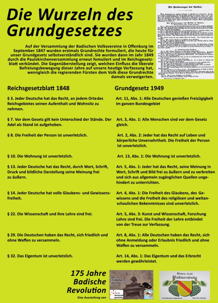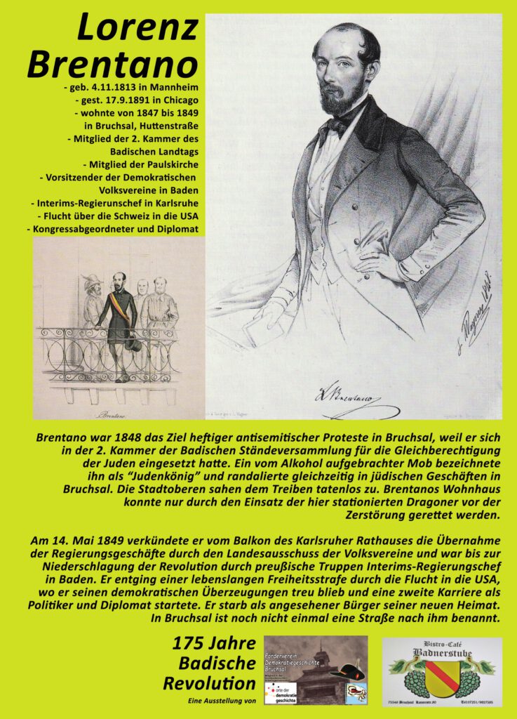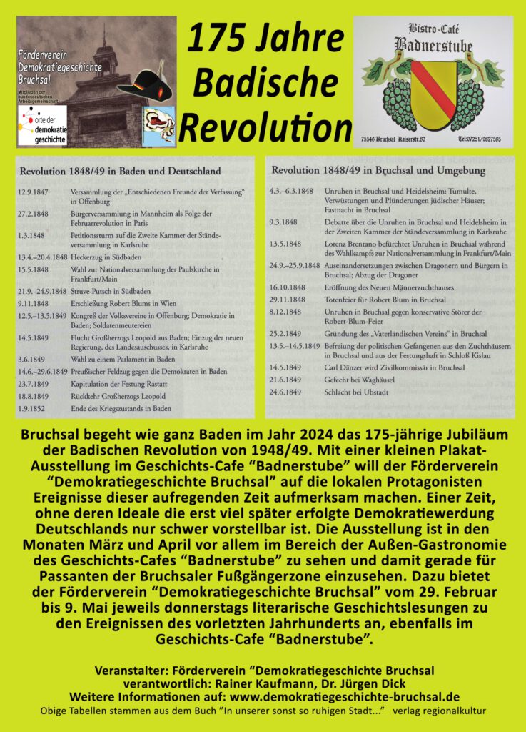 Zum 175-jährigen Jubiläum der Badischen Revolution im Jahr 2024 haben wir vom Förderverein „Demokratiegeschichte Bruchsal“ im Geschichts-Cafe „Badner Stuben“ in der Kaiserstraße eine Serie von literarischen Lesungen angeboten und diese in der Fußgängerzone mit einer Plakatausstellung zur Demokratiegeschichte Bruchsals untermauert. Hier die Plakate, die einen ersten Überblick zu dieser geschichtlichen Epoche geben. Die Sammlung kann jederzeit ergänzt und für zeitlich begrenzte Ausstellungen in Schulen oder Bibliotheken ausgeliehen werden.