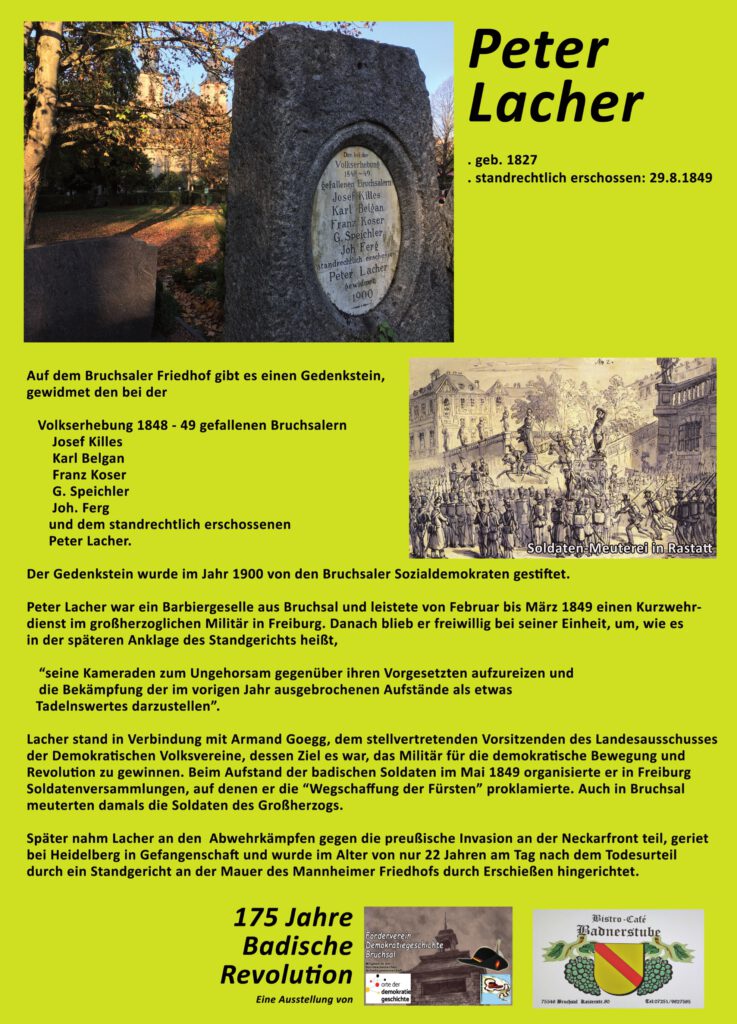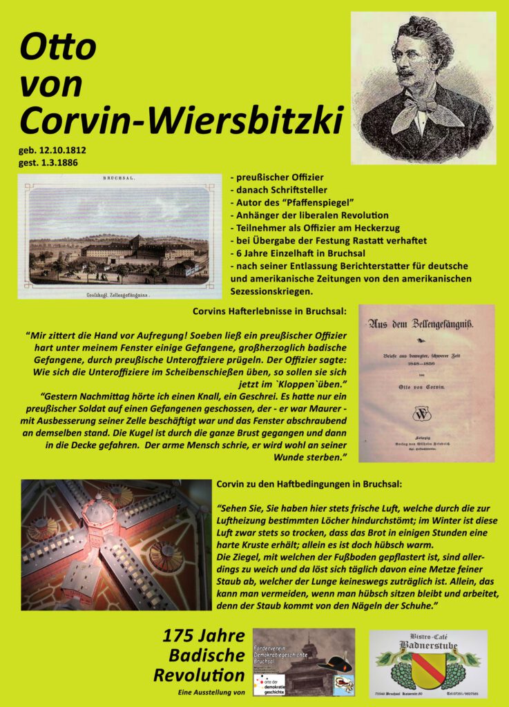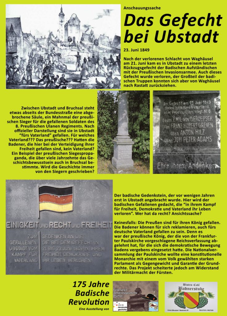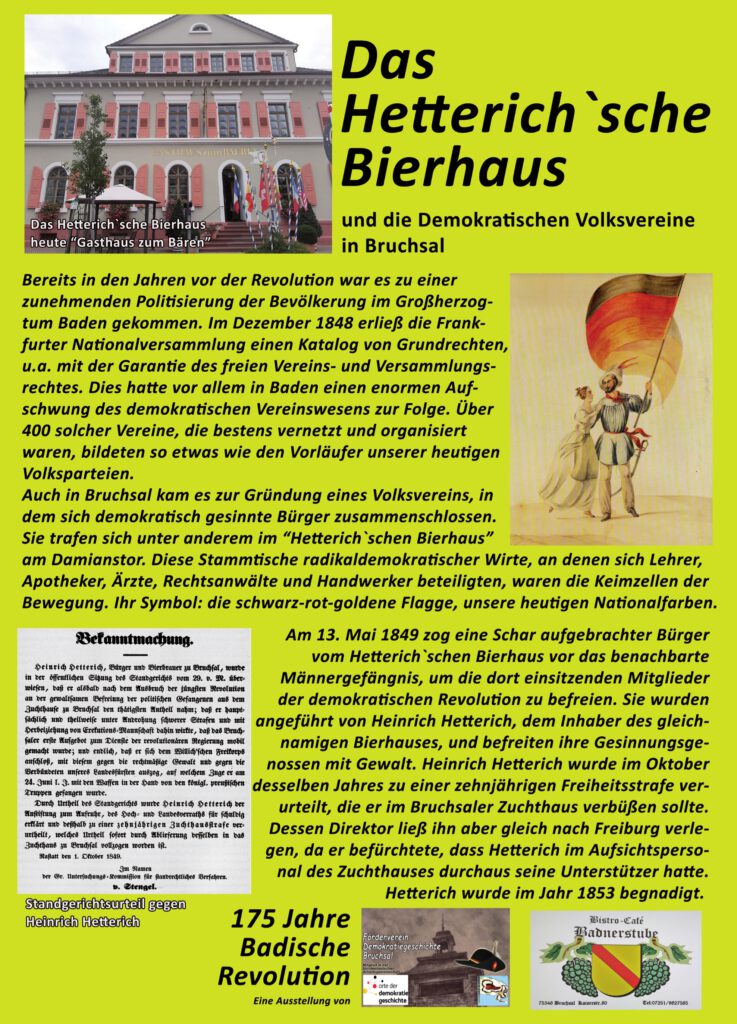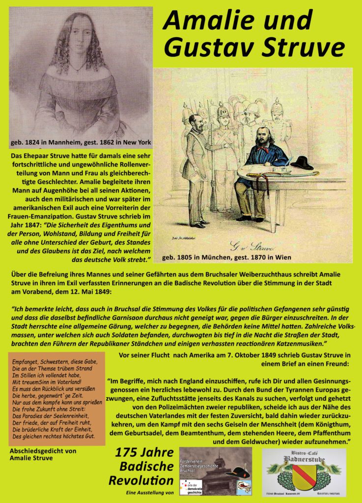 Zum 175-jährigen Jubiläum der Badischen Revolution im Jahr 2024 haben wir vom Förderverein „Demokratiegeschichte Bruchsal“ im Geschichts-Cafe „Badner Stuben“ in der Kaiserstraße eine Serie von literarischen Lesungen angeboten und diese in der Fußgängerzone mit einer Plakatausstellung zur Demokratiegeschichte Bruchsals untermauert. Hier die Plakate, die einen ersten Überblick zu dieser geschichtlichen Epoche geben. Die Sammlung kann jederzeit ergänzt und für zeitlich begrenzte Ausstellungen in Schulen oder Bibliotheken ausgeliehen werden.
